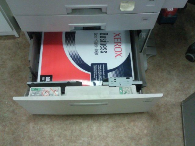 Chegando ao equipamento, o técnico verifica que a tinta está totalmente abastecida e resolve também verificar o local onde se coloca folhas e vê a seguinte cena: