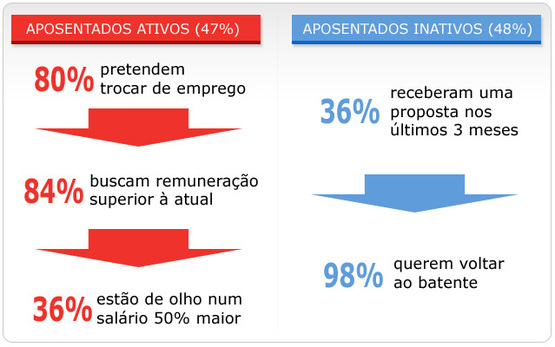 De acordo com o estudo, 36% dos aposentados inativos receberam pelo menos uma proposta nos últimos três meses, e dos 47% de aposentados ativos declarados, 80% pretendem trocar de emprego.