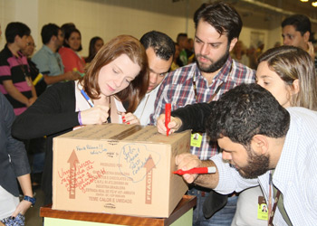 A última caixa foi passada de mão em mão pelos colaboradores até chegar ao caminhão. Eles escreveram mensagens e seus nomes nas caixas representando sua participação na produção dos ovos.