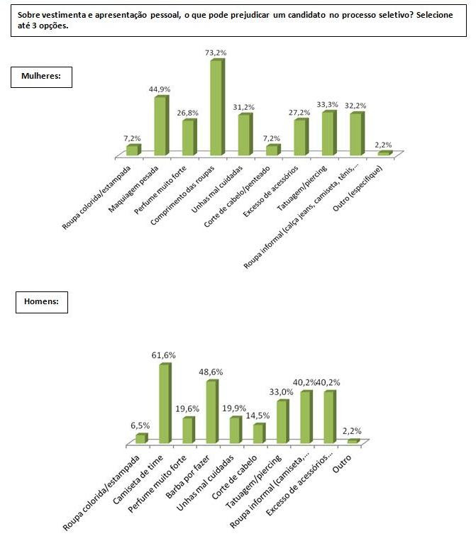 No quesito vestimenta e apresentação pessoal, as mulheres devem se preocupar com o comprimento das roupas e maquiagem muito pesada. Para os homens, os aspectos considerados incorretos são vários. Ganham destaque nessa lista o fato de ir à entrevista vestido com camisetas de time, barba por fazer ou excesso de acessórios.