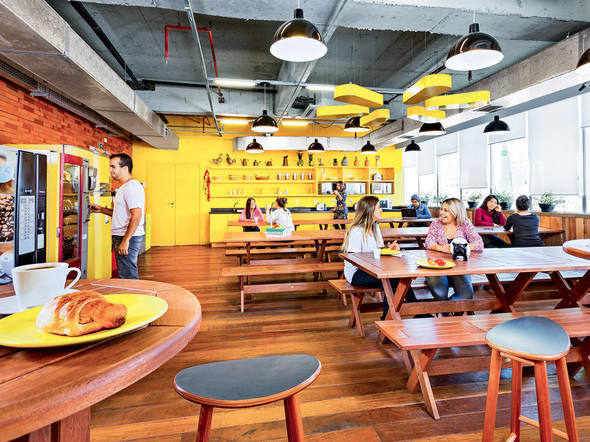 Esse clima campestre é reforçado pelas grandes janelas, que iluminam o local com a luz natural, e pelo tom vibrante do amarelo, uma das cores da companhia. É nesse ambiente, instalado no escritório em Alphaville, na Grande São Paulo, que cerca de 250 pessoas sentam e fazem as refeições diariamente.