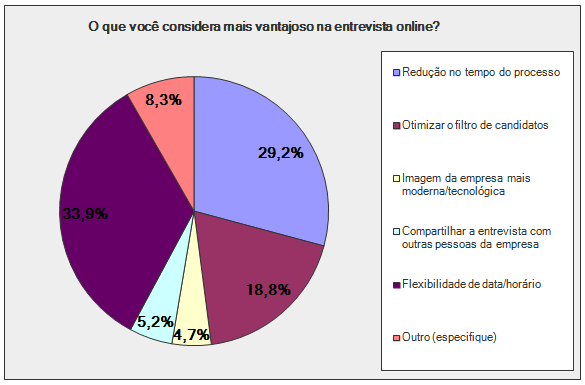 O resultado da pesquisa ainda mostrou que a maioria das empresas (83,5%) confirmam que o uso das entrevistas online em alguma etapa do processo de seleção é uma tendência, o que revela atraso nesta tendência. Questionadas sobre as vantagens da entrevista online, 33,9% das empresas avaliam a flexibilidade de data e horário como a principal, enquanto 29,2% entendem a redução no tempo do processo como mais vantajoso.