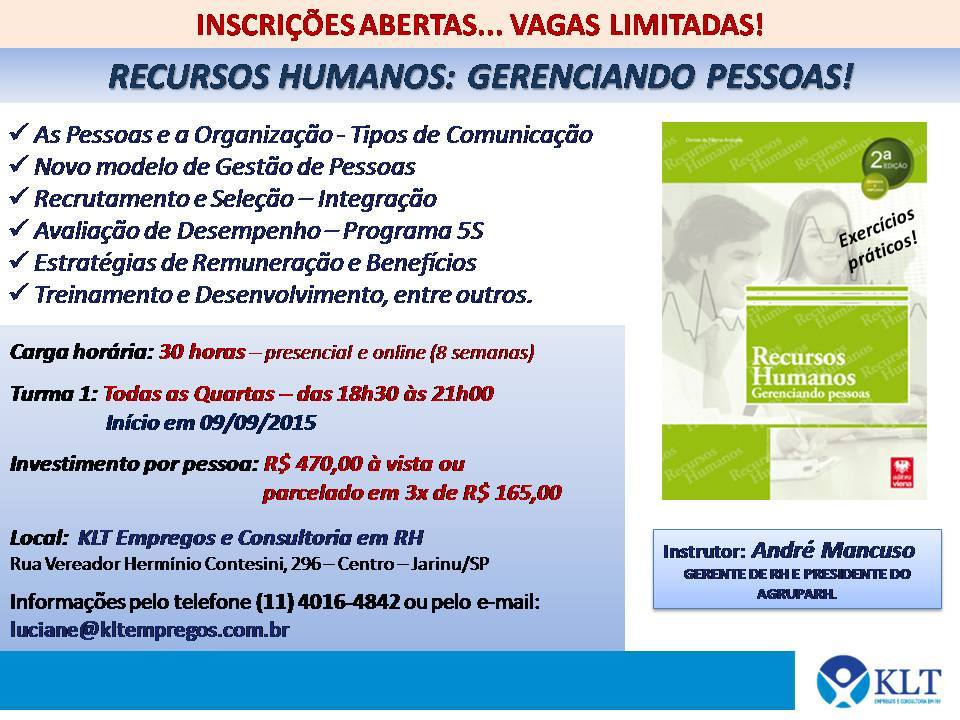Após formar com sucesso 2 Turmas no curso de Departamento Pessoal, a KLT Empregos de Jarinu, iniciou um novo curso Gestão de Pessoas – RH e a renovação de mais uma turma em Departamento Pessoal.