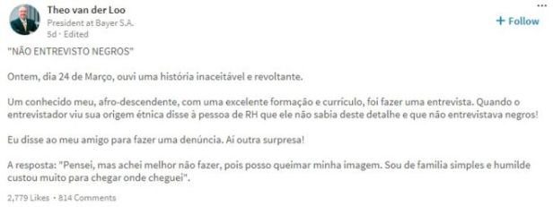 A denúncia partiu do presidente da multinacional Bayer no Brasil. Em seu perfil no LinkedIn, Theo van der Loo relatou uma história “inaceitável e revoltante” de preconceito racial.