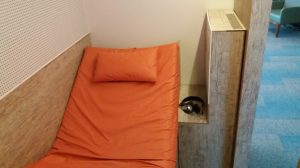 Chamadas de “cochilódromo”, as cabines individuais possuem ambientação que favorece a chegada do sono: as “camas” têm formato especial que favorece o relaxamento, a iluminação azul tem propriedade relaxante, o que ajuda a potencializar o cochilo, e é possível ouvir, com os fones de ouvido oferecidos, música clássica, new age ou sons da natureza. Tudo para auxiliar na indução do sono. Os ciclos de cochilos podem ser de até 30 minutos e as cabines devem ser reservadas por meio de aplicativo interno.