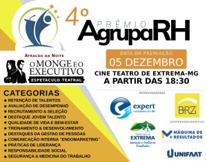A Associação Grupo de Recursos Humanos de Atibaia e Região “AGRUPARH” realiza em Extrema-MG no dia 05 de Dezembro mais uma edição do tradicionalíssimo “PREMIO AGRUPARH DE BOAS PRÁTICAS EM GESTÃO DE PESSOAS” evento anual que premia e reconhece o que de melhor está sendo feito em nossa região em termos de Gestão de Pessoas, conhecido como o “OSCAR DO RH”.