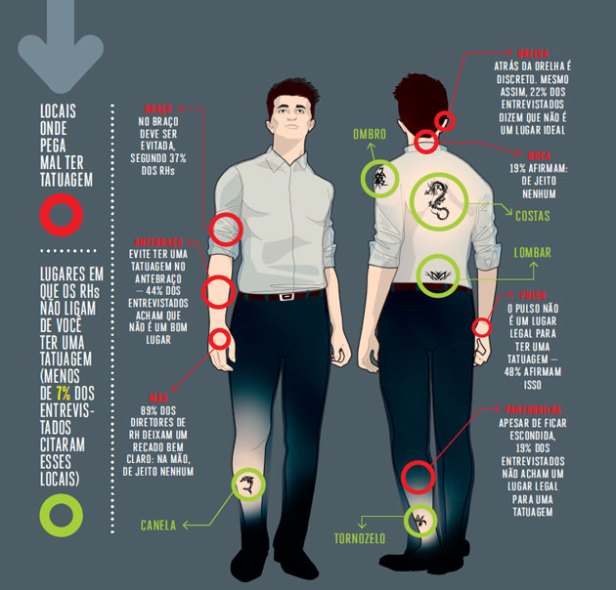 O que não vale é o recrutador inferir suas próprias crenças e conceitos na tatuagem alheia ou dar grande peso a esse “quesito”. Afinal, nas vagas de emprego tratamos os critérios de grande peso como “imprescindíveis”. Nada pareceria mais estúpido do que um anúncio que diga “imprescindível não ter tatuagem”.